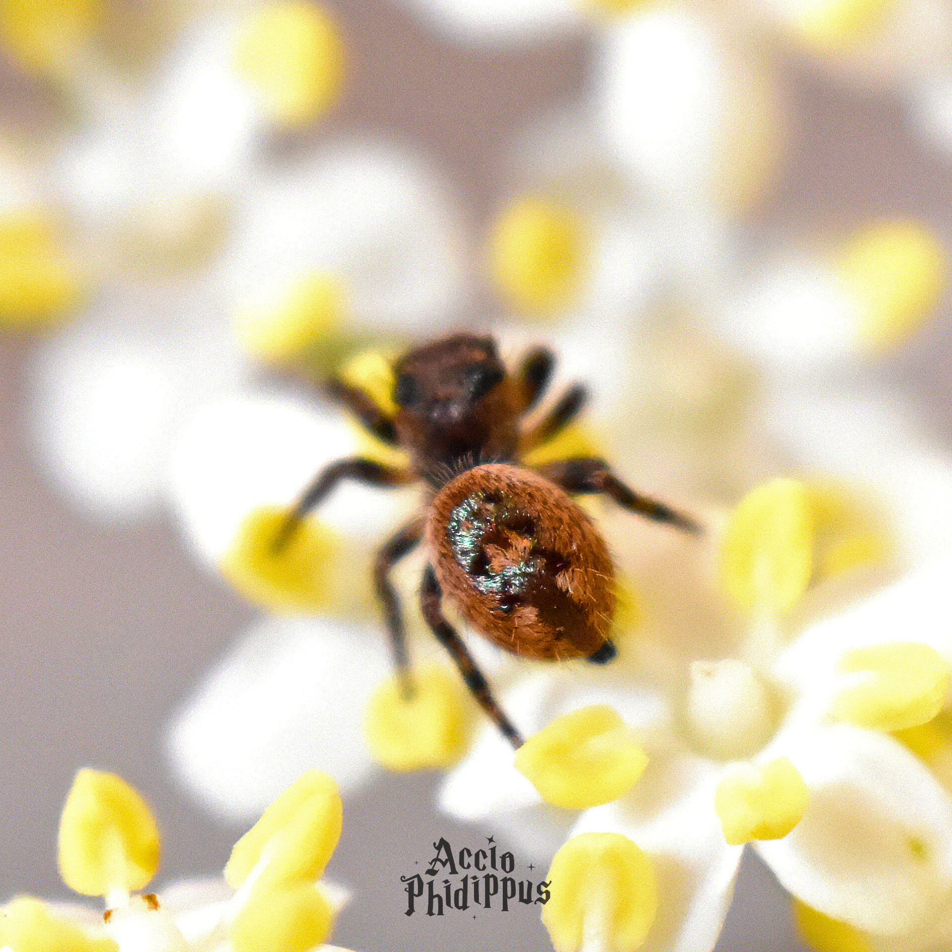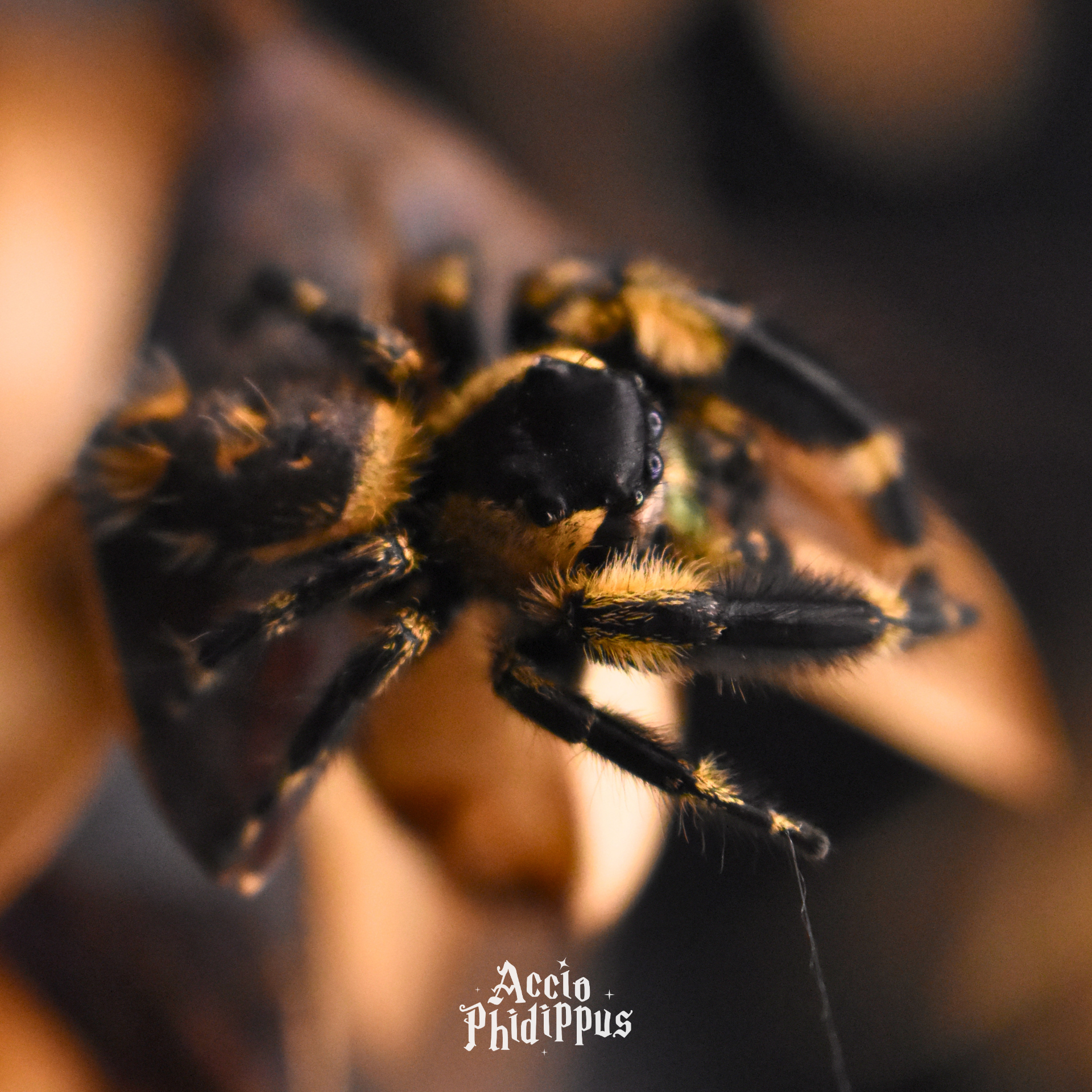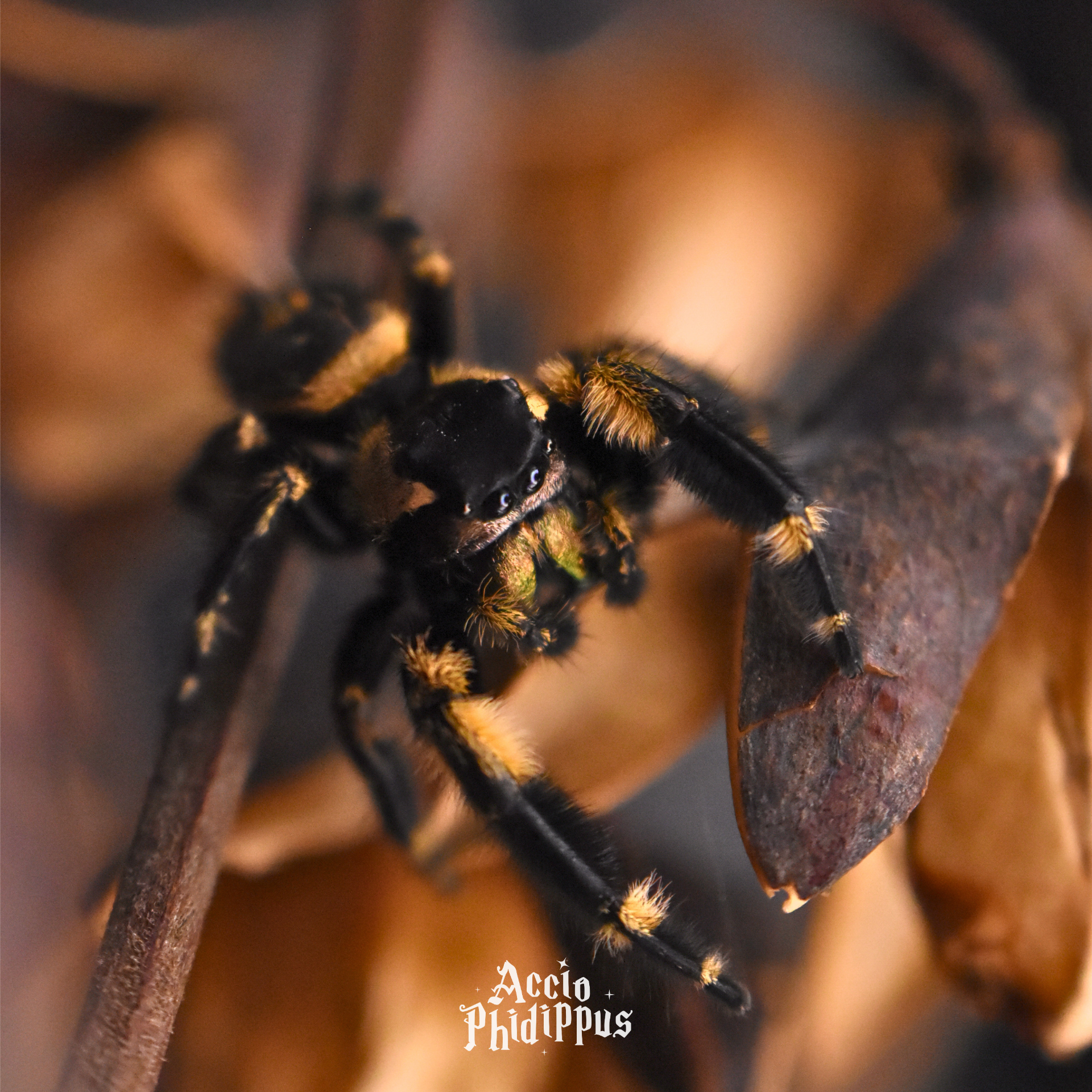 Femelle : La femelle est connue pour sa taille imposante pouvant aller jusqu’à plus de 2 cm, avec des reflets uniques sur tout le corps. Elle arbore souvent des nuances orangées, jaunes, ou des tons très clairs voire blancs/écrus, avec un liserait blanc très marquée sous les yeux, et des cils très apparents. La petite particularité de l’espèce : tous leurs reflets sont irisés.