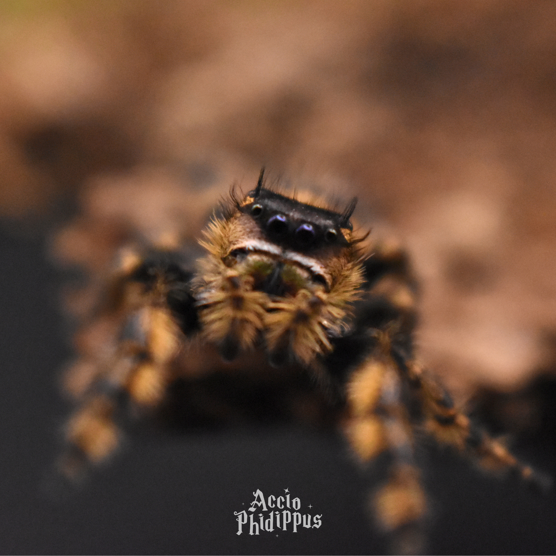 Très longs cils | Reflets des poils irisés | Coloration jaune-orangée sur fond sombre | Grands yeux frontaux | Pilosité importante